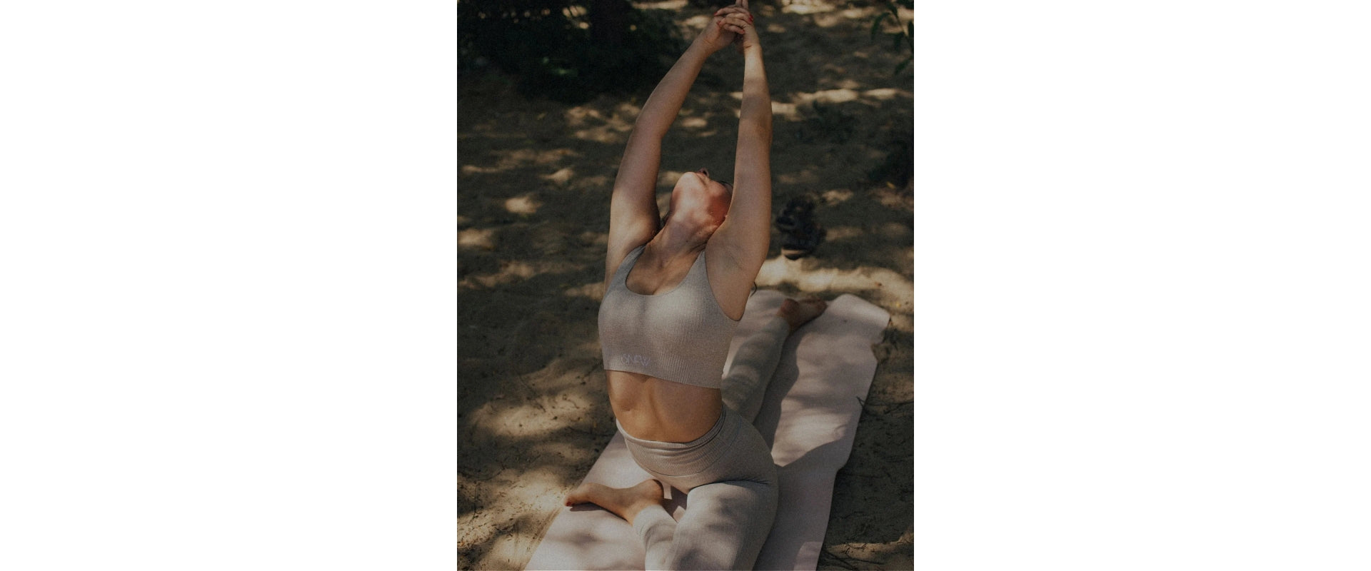 A realistic lifestyle photo in a gym with a fit woman stretching beside a yoga mat, gym bag, and water bottle, natural lighting, clean space, motivational energy.