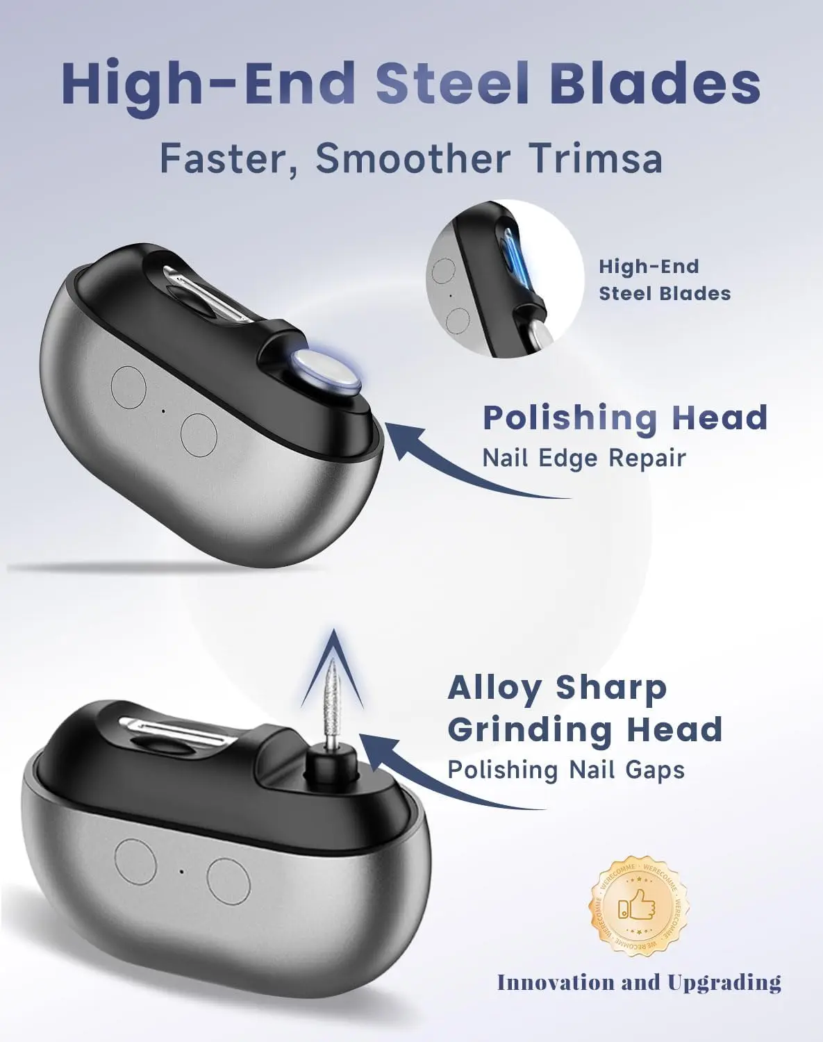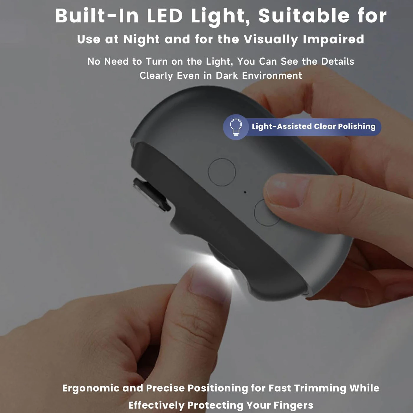 This portable device combines nail clipping, trimming, and polishing functions in one compact tool. The built-in LED light helps improve visibility during use, while the enclosed nail storage design helps keep the trimming process tidy.